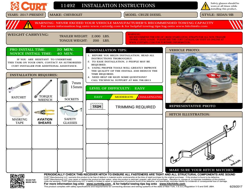 However you define adventure -- whether its climbing onto the back of a mountain bike, hunting from the top of a tree stand or camping with the family a long way from nowhere -- CURT class 1 hitches provide a light-duty towing receiver to help you Bring It. Each is made to fit a specific vehicle, providing easier installation, a better fit and optimal towing capacity. Custom class 1 trailer hitches are available for a variety of smaller vehicle types, including the compact car, crossover, minivan and small SUV. This particular class 1 hitch is designed to be a custom hitch for certain years of the Chevy Cruze (to verify vehicle compatibility, see the CURT application guide at curtmfg.com). Tested in accordance with SAE J684, it offers a weight carrying capacity of 2,000 lbs. GTW and 200 lbs. TW. It is equipped with 1-1/4 in. receiver tube opening to accept a ball mount shank or other hitch mount. This class 1 hitch also comes with all necessary mounting hardware. With its lightweight design and smaller receiver tube size, a class 1 hitch is especially useful for adding cargo space with a hitch-mounted bike rack or cargo carrier. They can also typically be used to tow small trailers such as a utility trailer, kayak trailer or teardrop camper (never exceed the lowest weight capacity of any towing component; i.e. the vehicle, hitch, trailer, etc). Though CURT class 1 trailer hitches are only intended for light-duty towing, we apply the same principles of quality as we do to the rest of our rear mount hitches. Each class 1 hitch is made with hands-on engineering, high-strength steel and precise welding. We use a co-cured finish of liquid A-coat, inside and out, and durable black powder coat to provide a lasting defense against rust, chips and UV rays.