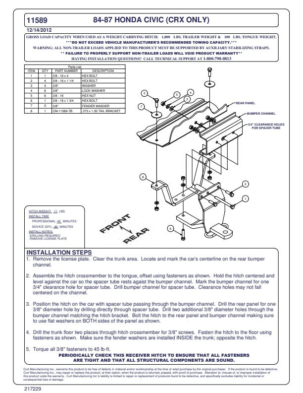 CURT class 1 trailer hitches are the lightest-duty hitches of our rear mount lineup. They are engineered for reliability, welded together with quality steel and blasted clean for a smooth finish. Tested to meet the strict demands of the industry, this CURT class 1 hitch has a capacity to tow up to 1,000 lbs. of gross trailer weight and 100 lbs. of tongue weight. This means it can handle a variety of small trailers such as single-axle utility trailers, canoe and kayak trailers, dirt bike trailers and more (NOTE: Never exceed the lowest weight capacity of any towing component; i.e. the vehicle, hitch, trailer, etc). This class 1 hitch is a fixed-tongue hitch, having a fixed draw bar to accept a trailer ball rather than a receiver tube to accept a ball mount. Class 1 hitches are typically mounted on compact cars, full-size cars and some smaller crossover SUVs, minivans and compact SUVs. This particular hitch is designed to be a custom-fit trailer hitch for certain years of the Honda Civic hatchback CRX (to verify your vehicle compatibility, see the CURT application guide at curtmfg.com). It comes with all necessary installation hardware. Each CURT class 1 hitch is co-cured with a liquid A-coat and a high-gloss black powder coat that provide a lasting defense against rust, wear and harmful UV rays.