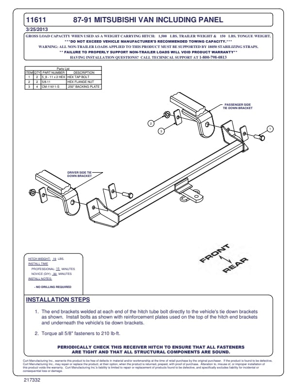 CURT class 1 trailer hitches are the lightest-duty hitches of our rear mount lineup. They are engineered for reliability, welded together with quality steel and blasted clean for a smooth finish. Tested to meet the strict demands of the industry, this CURT class 1 hitch has a capacity to tow up to 1,500 lbs. of gross trailer weight and 150 lbs. of tongue weight. This means it can handle a variety of small trailers such as single-axle utility trailers, canoe and kayak trailers, dirt bike trailers and more (NOTE: Never exceed the lowest weight capacity of any towing component; i.e. the vehicle, hitch, trailer, etc). This class 1 hitch is a fixed-tongue hitch, having a fixed draw bar to accept a trailer ball rather than a receiver tube to accept a ball mount. Class 1 hitches are typically mounted on compact cars, full-size cars and some smaller crossover SUVs, minivans and compact SUVs. This particular hitch is designed to be a custom-fit trailer hitch for certain years of the Mitsubishi van (including panel and cargo) (to verify your vehicle compatibility, see the CURT application guide at curtmfg.com). It features a square tube frame and comes with all necessary installation hardware. Each CURT class 1 hitch is co-cured with a liquid A-coat and a high-gloss black powder coat that provide a lasting defense against rust, wear and harmful UV rays.