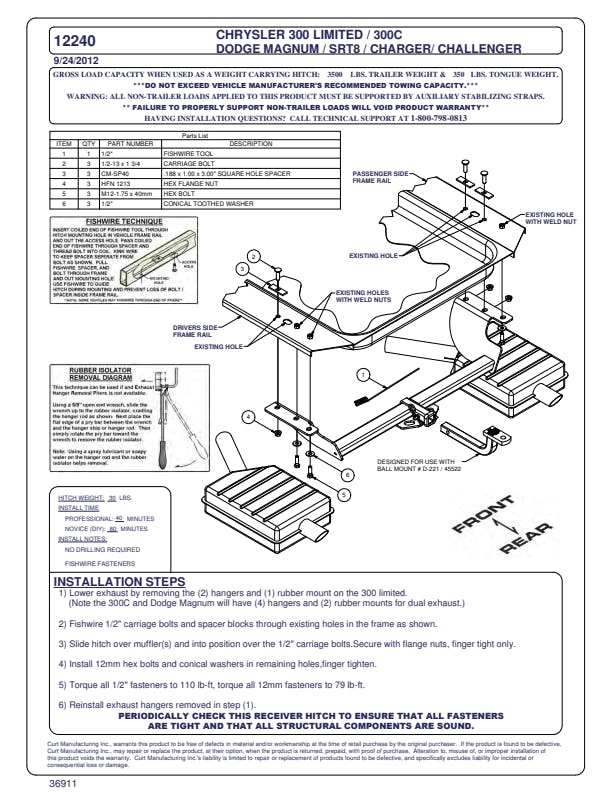 Whatever the next checkpoint is on your adventure -- whether it's getting your bike on the trail before sunrise or making it to the campground before dark -- CURT class 2 hitches let you Bring It with confidence. These receiver hitches are made to handle most light-duty towing applications and offer a custom fit for your vehicle. Typically used on full-size cars, crossovers, compact SUVs, minivans or even compact pickup trucks, a CURT class 2 trailer hitch complements the design of smaller vehicles. This particular class 2 hitch is made to be a custom hitch for certain years of the Dodge Challenger, Charger, Magnum and Chrysler 300 (to verify vehicle compatibility, see application info). It offers a weight carrying capacity of 3,500 lbs. GTW and 350 lbs. TW. Class 2 trailer hitches can typically be used to tow a variety of lightweight trailers, such as a small utility trailer, small fishing boat trailer or popup camper (NOTE: Never exceed the lowest weight capacity of any towing component). They are also perfect for adding cargo space to your vehicle with a bike rack or cargo carrier. This class 2 hitch features a 1-1/4 receiver tube to accept a ball mount shank or other hitch-mounted accessory. For safety, it is tested in accordance with SAE J684. A custom trailer hitch design requires extra care, and as such, CURT class 2 hitches are engineered using real vehicles and hands-on research. We use high-strength steel, robotic welding and rigorous testing to produce hitches that are built to fit your lifestyle. To ensure that each hitch will be a reliable extension of your vehicle, we also finish our hitches in a co-curing of liquid A-coat and black powder coat, giving them long-lasting rust and wear resistance.