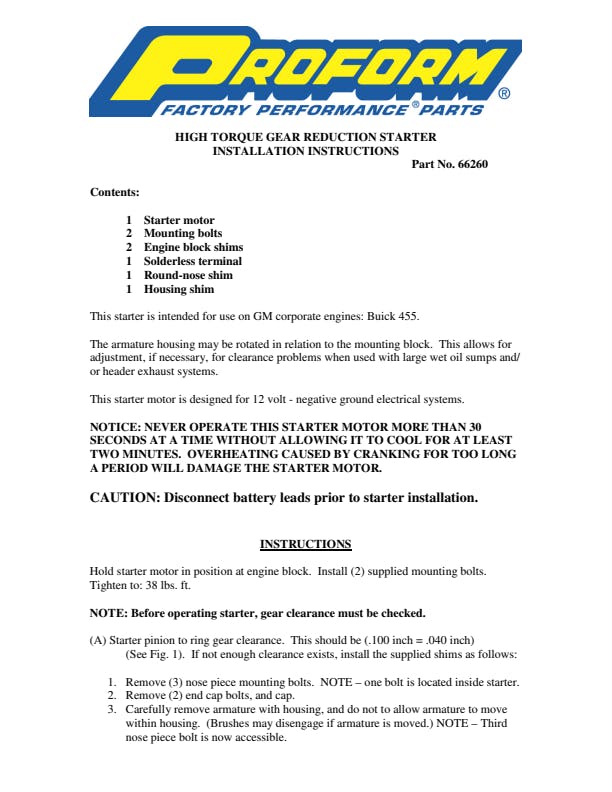 High-torque, gear-reduction design., High-torque, gear-reduction design., Offset design results in more clearance between the oil pan and the starter, and can be rotated for additional chassis clearance., The high-torque, high-output motor spins the engine over faster than stock starters, delivering 40-50% more cranking power., 3.75-to-1 sealed gear-reduction drive and full ball bearing construction., Includes shims to set pinion-gear engagement (when necessary)., Approved by all leading sanctioning organizations. |
