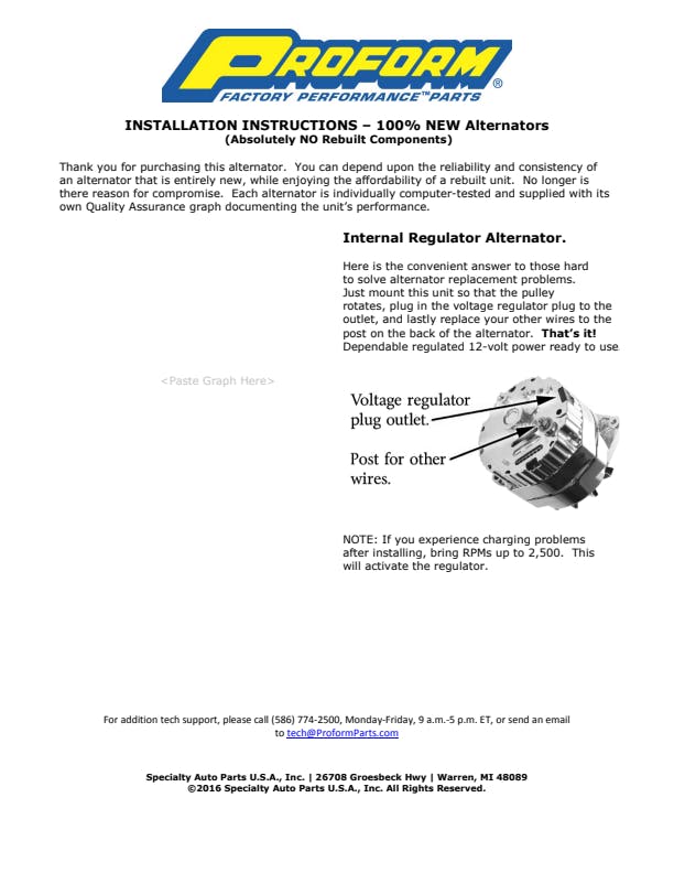 | Feature/Benefit | A manufacturing break-through has enabled PROFORM to offer 100% NEW alternators with the same affordability as our popular re-built models!, A manufacturing break-through has enabled PROFORM to offer 100% NEW alternators with the same affordability as our popular re-built models!, Each unit is supplied with its own individual Quality Assurance graph documenting its performance and is easily identified by the machined pulley. |
