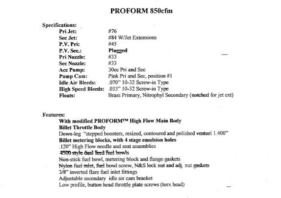 Next Gen Race Series Carbs are HERE! PROFORM is taking its popular carburetors and making them even better! Here are the NEW Features: Main Body: Completely new main body design with contoured venturis and new 2-step down-leg boosters. The combination creates better air flow and increased fuel atomization! Fuel Bowls: Completely new design with increased internal baffling and a lower fuel ramp. The metering blocks also have a new baffle designed to work in conjunction with the bowl baffles to reduce fuel slosh and increase control. Throttle Base Plate: Slabbed shafts for increased airflow are now standard! In addition to these new features are all the great features that define the Race Series from the competition. Hand assembled and dyno tested in the U.S.A. by racers for racers! All PROFORM Race Series Carbs include the following: PROFORM's innovative all-aluminum next-gen main body with adjustable screw-in air bleeds and torx head squirters. Billet aluminum throttle base plate that is fully adjustable for fine tuning, and won't warp. The throttle lever is compatible with Ford kickdown bracketry, and the secondary opening rate can be adjusted with a linkage kit (sold separately). The billet aluminum metering blocks have a new fuel baffle design that integrates with the fuel bowl float for better fuel control. The metering blocks are fully adjustable as they always have been. Lastly, the aluminum fuel bowls with sight glass windows and billet fittings are a new design that is optimized with new features for better fuel control and easy float setting.
